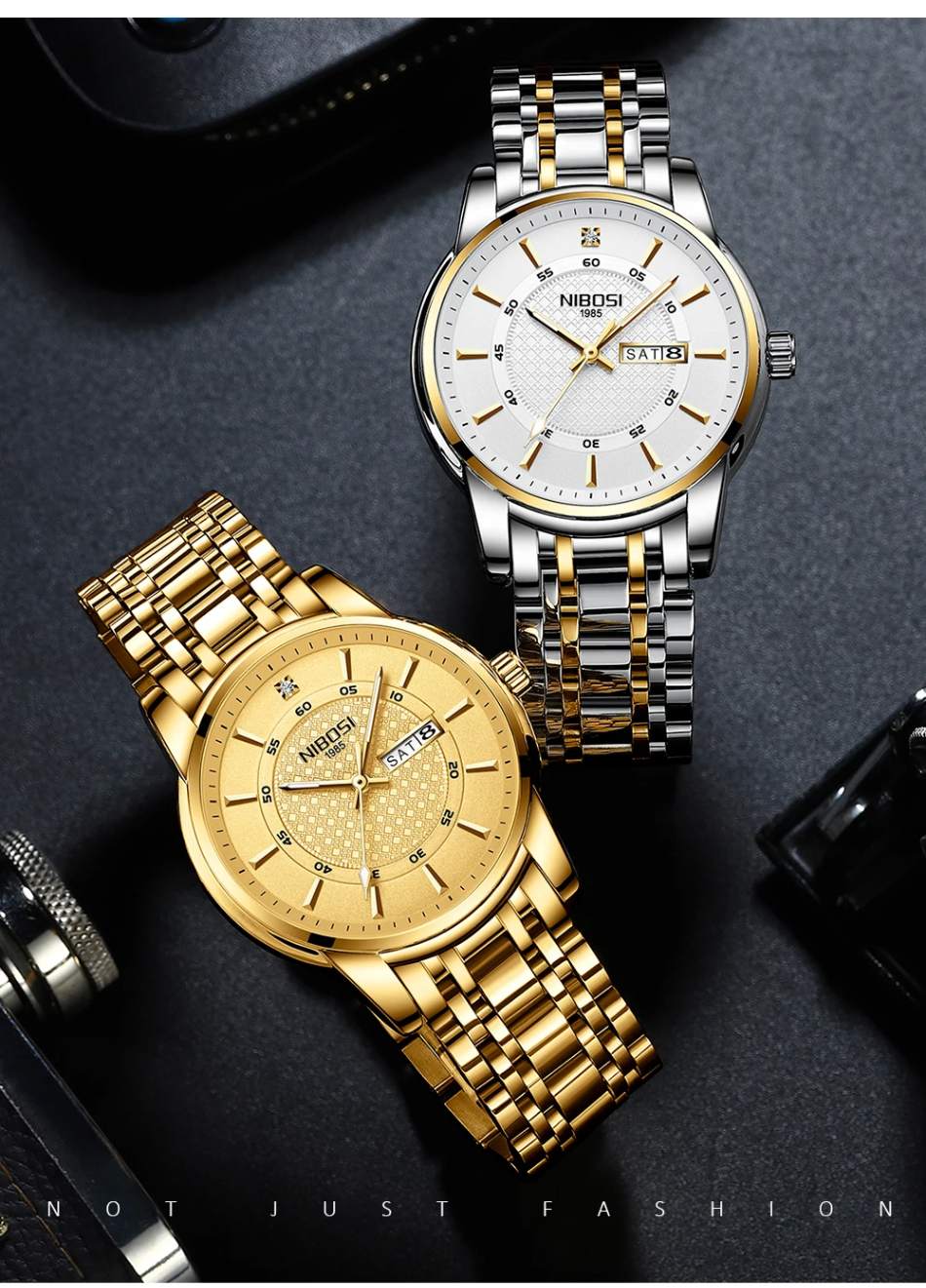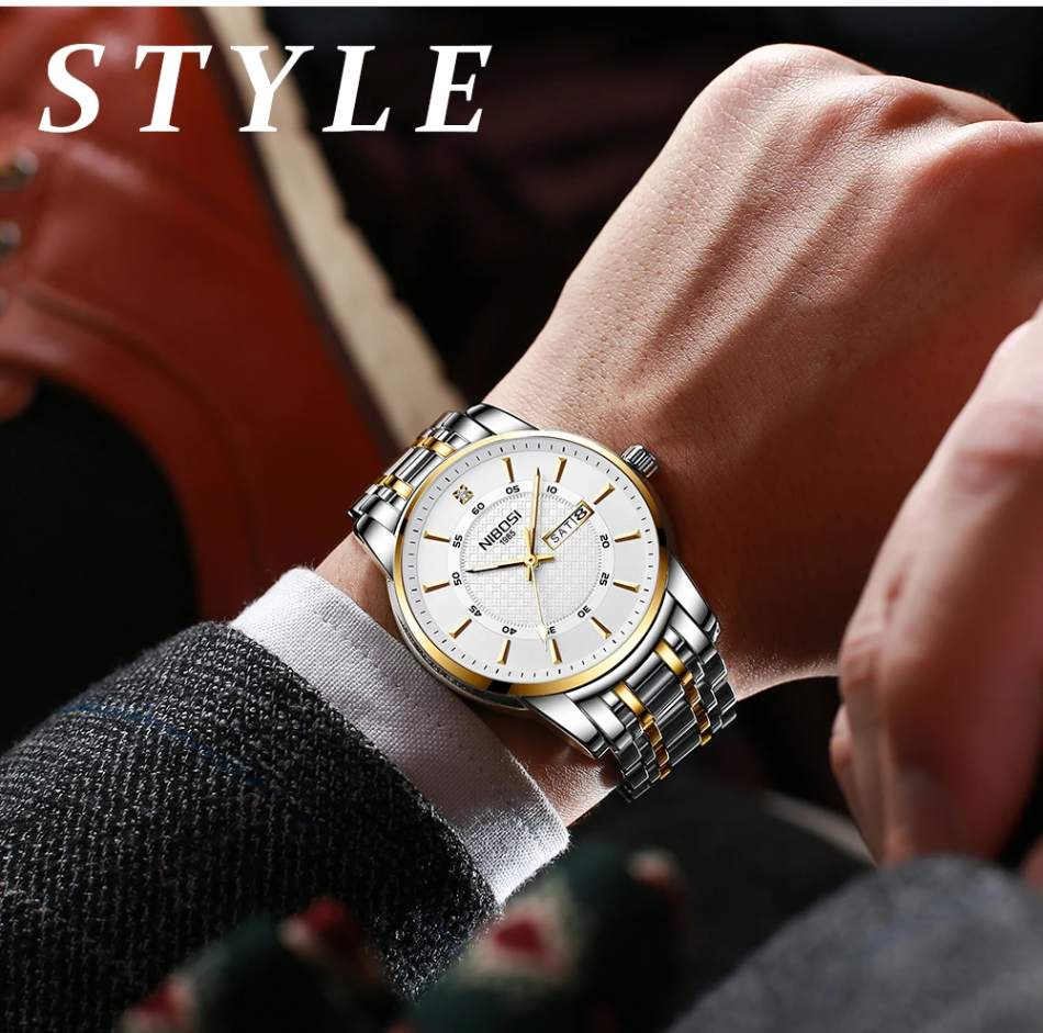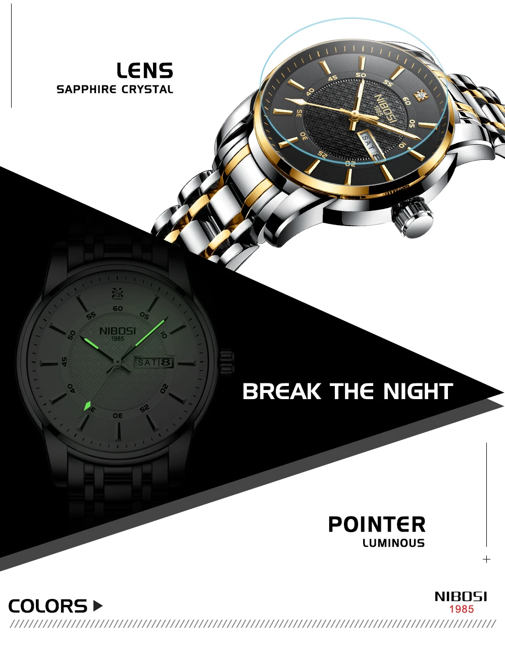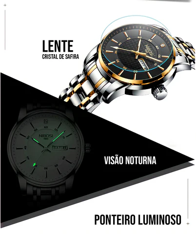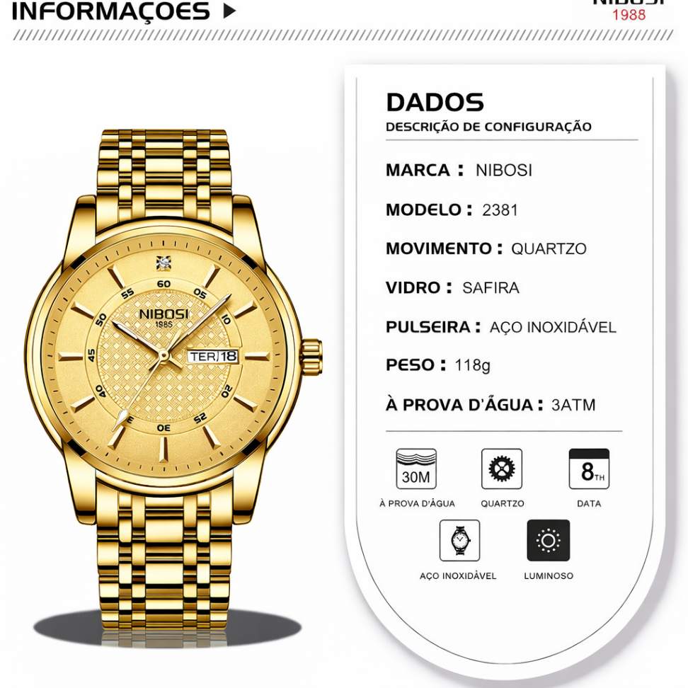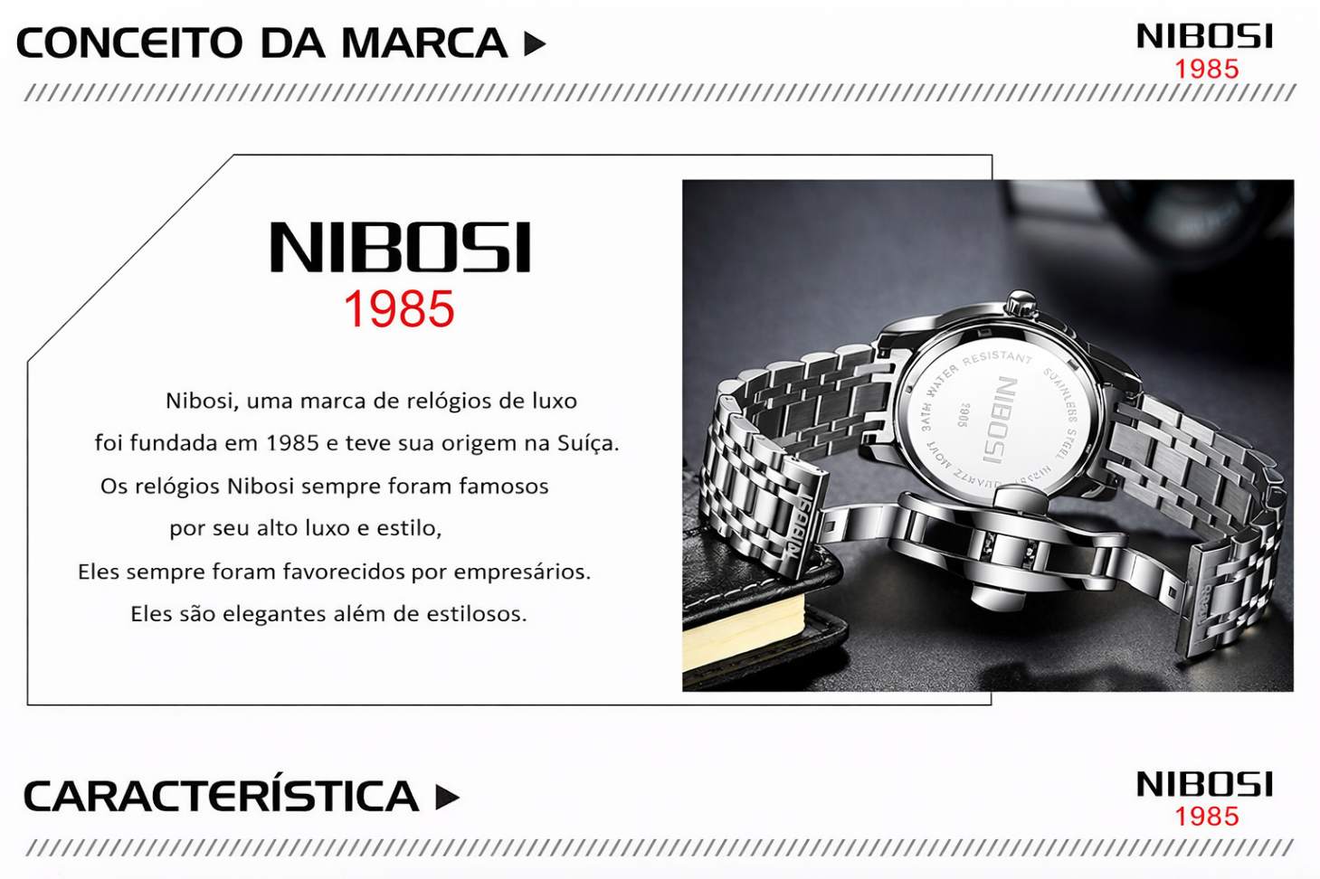 Especialmente fabricado em aço inoxidável de excelentíssima qualidade, lente de cristal de safira e acabamento de quartzo, o luxuoso relógio Nibosi proporciona um aspecto de modernidade e muita elegância para o seu dia-dia